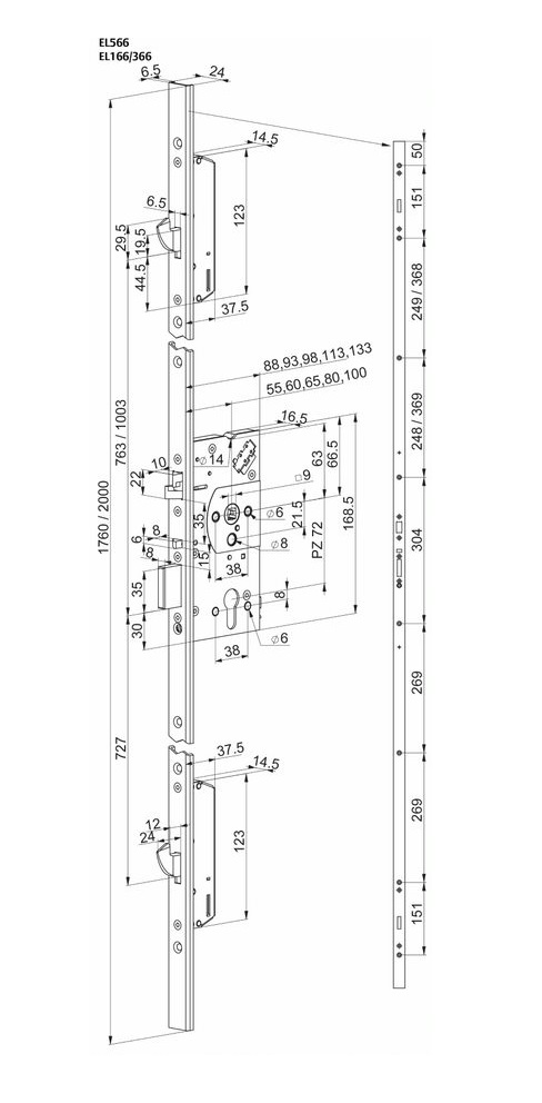 Panikový zámek se signalizací EL366 Multipoint - Samozamykací mechanická verze s elektrickou signalizací bez elektrického ovládání - stejná mechanická funkce jako EL166 s možností monitorovat funkci kliky, závory, klíče, dveří. Pro možnost využití monitorovací funkce je nutné k zámku přivést kabel EA218 nebo EA219.