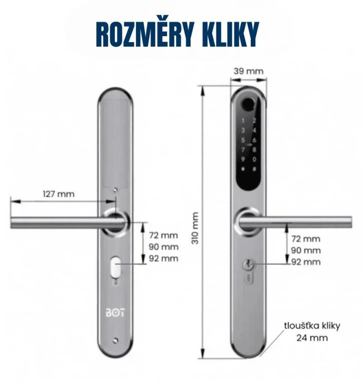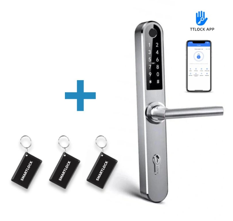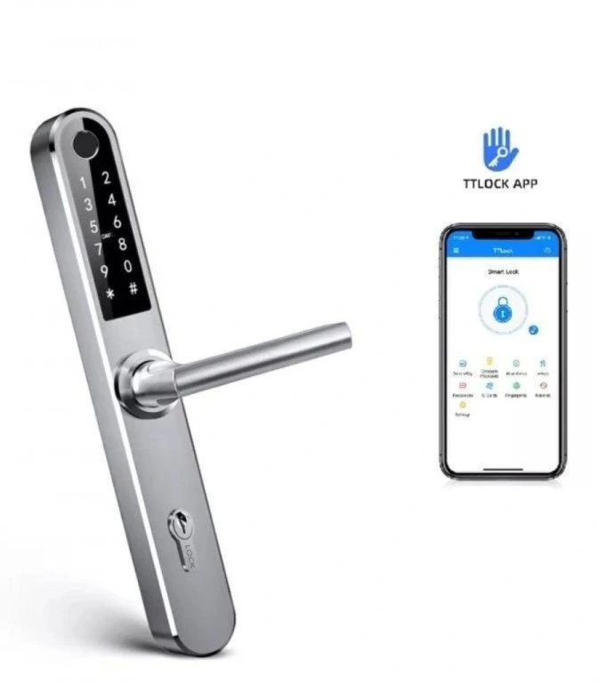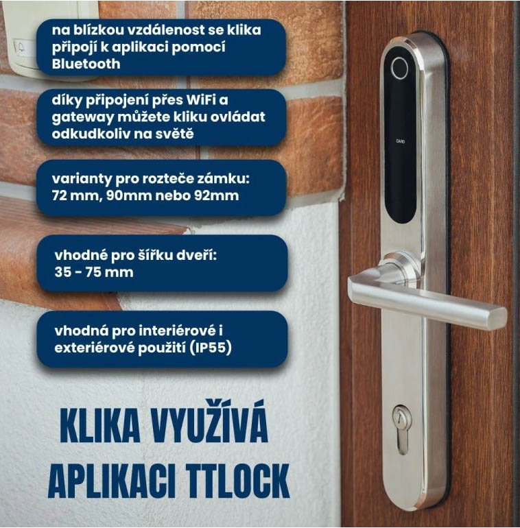 Bluetooth / WiFi chytrá klika, vhodná pro interiérové i exteriérové použití, ovládání přes aplikaci TTlock, 5 možností odemykání (klíč, otisk prstu, číselný kód, čipová karta, mobilní telefon), varianty na rozteč zámku 72 mm, 90mm nebo 92mm, doporučená tloušťka dveří 35-75 mm, možnost pravé i levé orientace, napájení bateriemi 4ks AA, stříbrná
