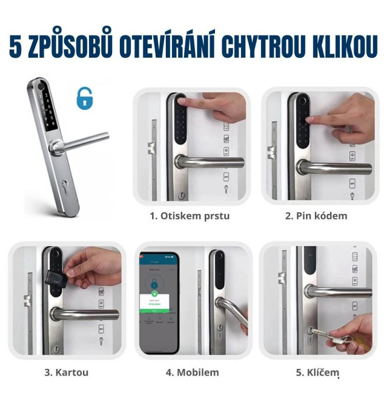 ✔ Až 200 otisků prstů, 200 čipových karet a 150 individuálních hesel