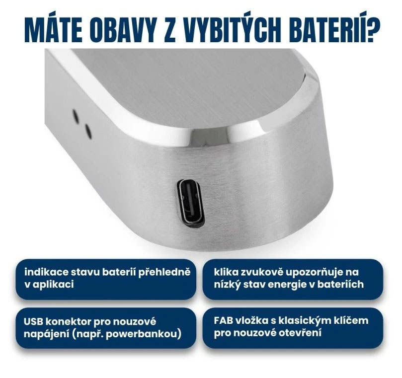 2. Zvukové upozornění přímo na klice: v případě poklesu energie v bateriích vás klika upozorní, že nadešel čas na jejich výměnu.