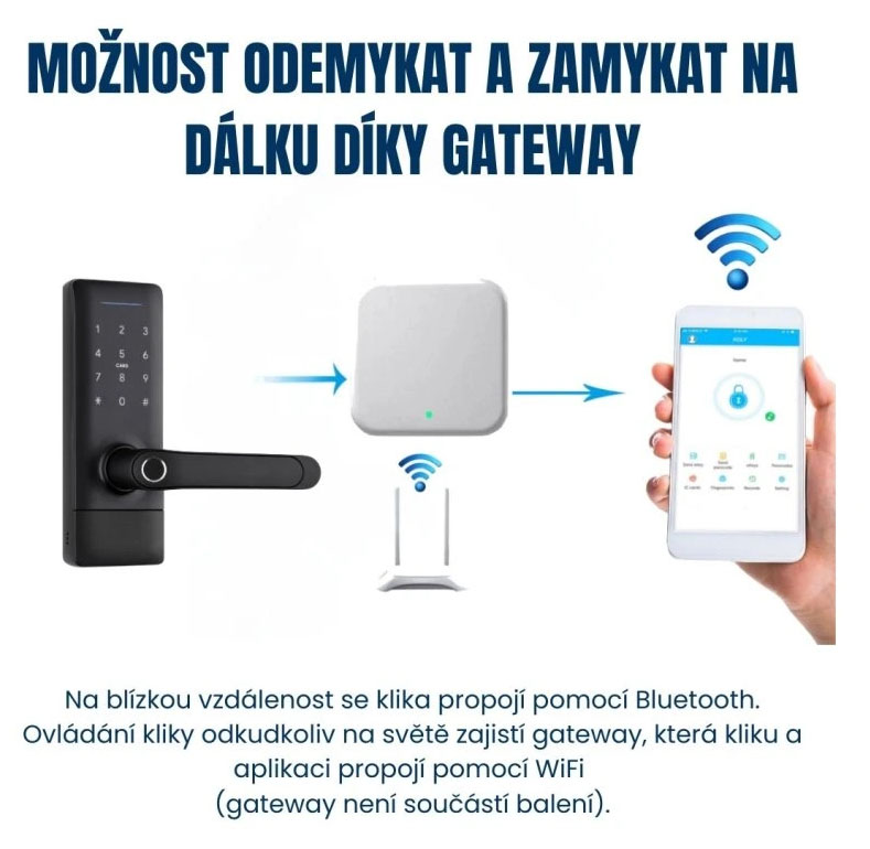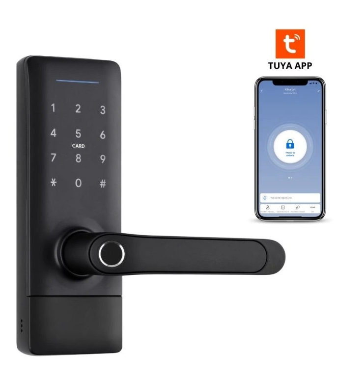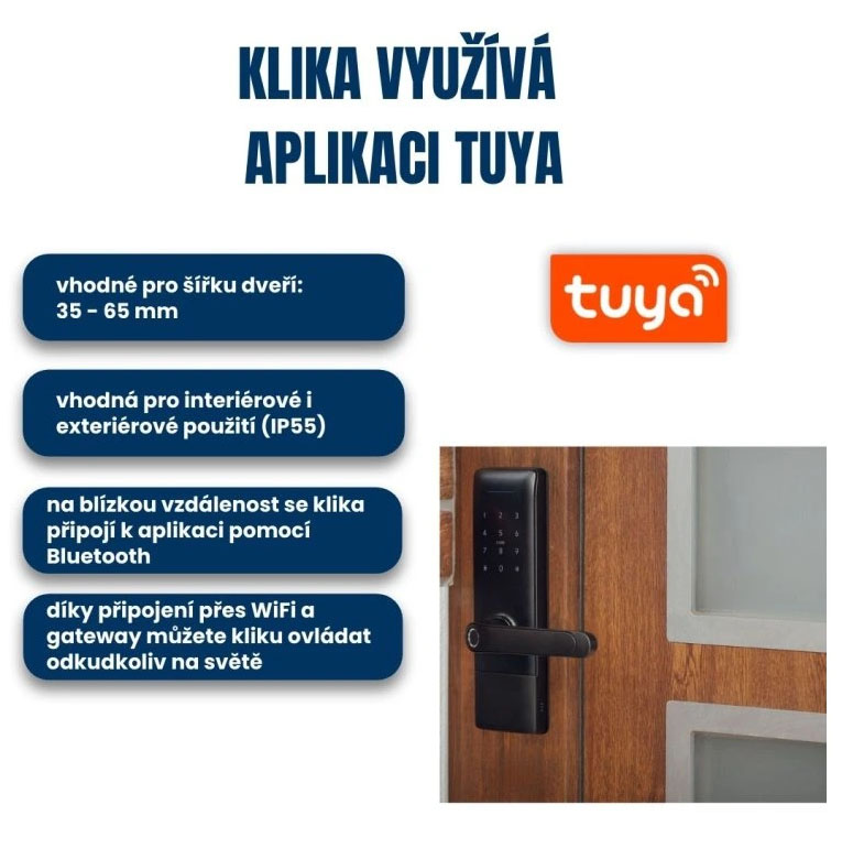 Bluetooth / WiFi chytrá klika, vhodná pro interiérové dveře a ideální pro hotely, penziony a jiné komerční použití. Nelze kombinovat s cylindrickou vložkou, ovládání přes aplikaci Tuya, 5 možností odemykání (klíč, otisk prstu, číselný kód, čipová karta, mobilní telefon), vhodná pro všechny běžné rozteče zámků, doporučená tloušťka dveří 35-65 mm, možnost pravé i levé orientace, napájení bateriemi 4ks AAA, černá