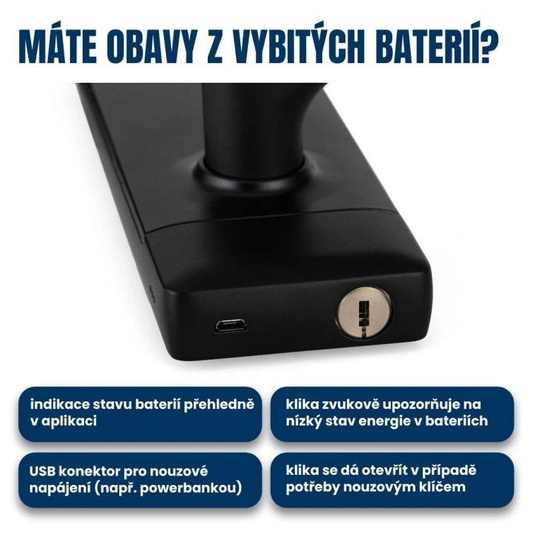2. Zvukové upozornění přímo na klice: v případě poklesu energie v bateriích vás klika upozorní, že nadešel čas na jejich výměnu.