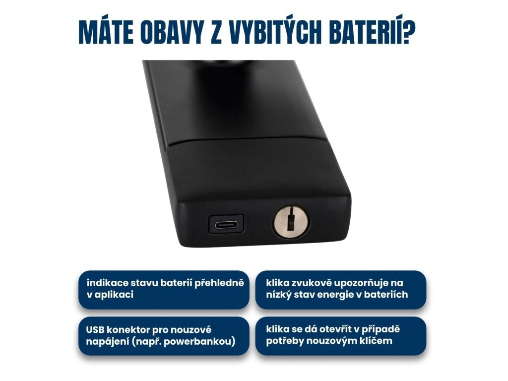 3. USB konektor pro nouzové napájení: klice můžete poskytnout krátkodobě energii třeba díky powerbance, napájení ze sítě atd.