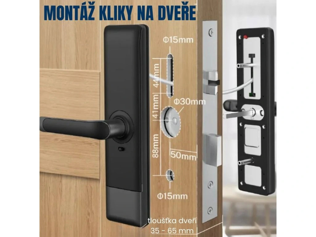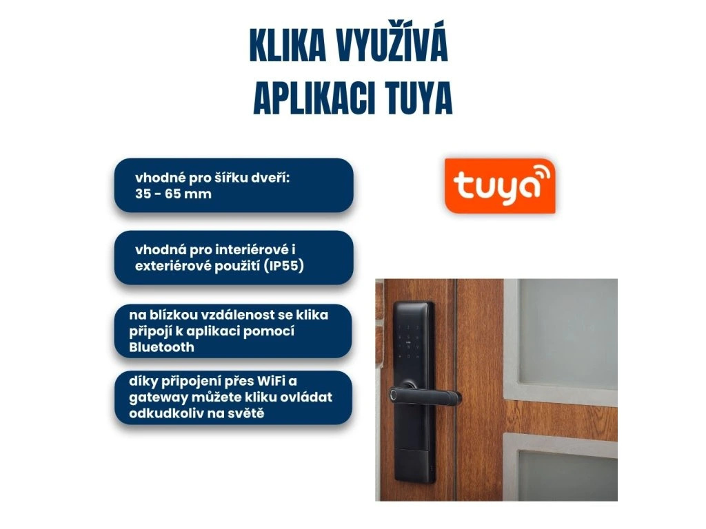 Bluetooth / WiFi chytrá klika, vhodná pro interiérové dveře a ideální pro hotely, penziony a jiné komerční použití. Nelze kombinovat s cylindrickou vložkou, ovládání přes aplikaci Tuya, 5 možností odemykání (klíč, otisk prstu, číselný kód, čipová karta, mobilní telefon), vhodná pro všechny běžné rozteče zámků, doporučená tloušťka dveří 35-65 mm, možnost pravé i levé orientace, napájení bateriemi 4ks AAA, černá