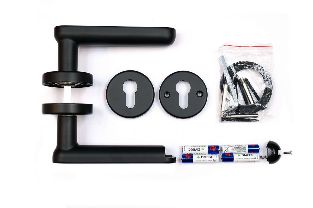 • Balení obsahuje: 1x pár „Smart Touch Handle“, 1x pár rozet pro cylindrickou vložku, 1x pár silikonových podložek pod rozetu kliky, 4x baterie AAA, instalační materiál a šroubovák.