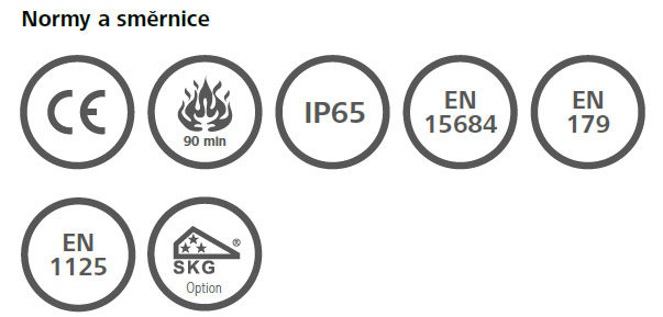 Normy a směrnice - kontrola podle směrnic CE | EN 1634: 90 minut | třída ochrany IP65 | EN 15684: 1.6.B.3.A.F.3.2 | vhodná pro zámky podle EN 179/1125 (při použití bezpečnostní funkce pro případ paniky FAP) | SKG***