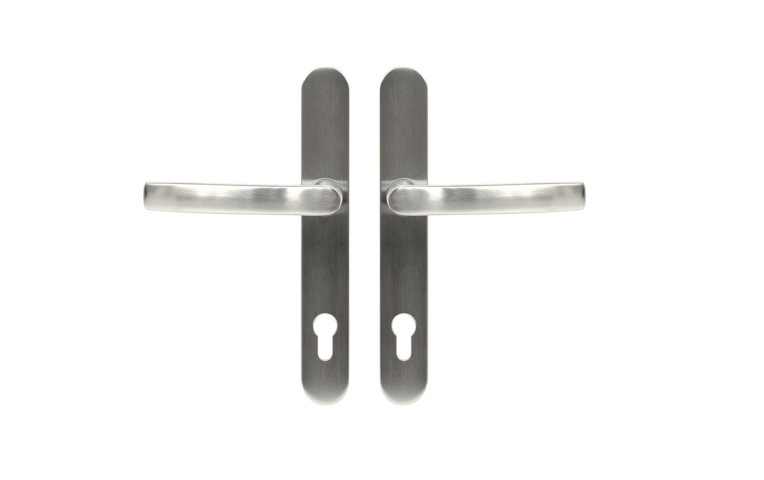 • Masivní štítové kování z nerezového materiálu s pevně uloženou klikou a vratným mechanismem vhodné pro vstupní plastové dveře.