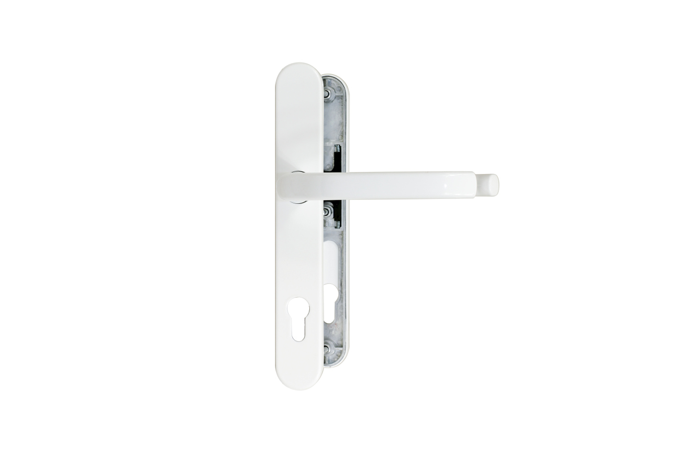 • Štítové kování z hliníku s pevně uloženou klikou a vratným mechanismem vhodné pro vstupní plastové dveře.