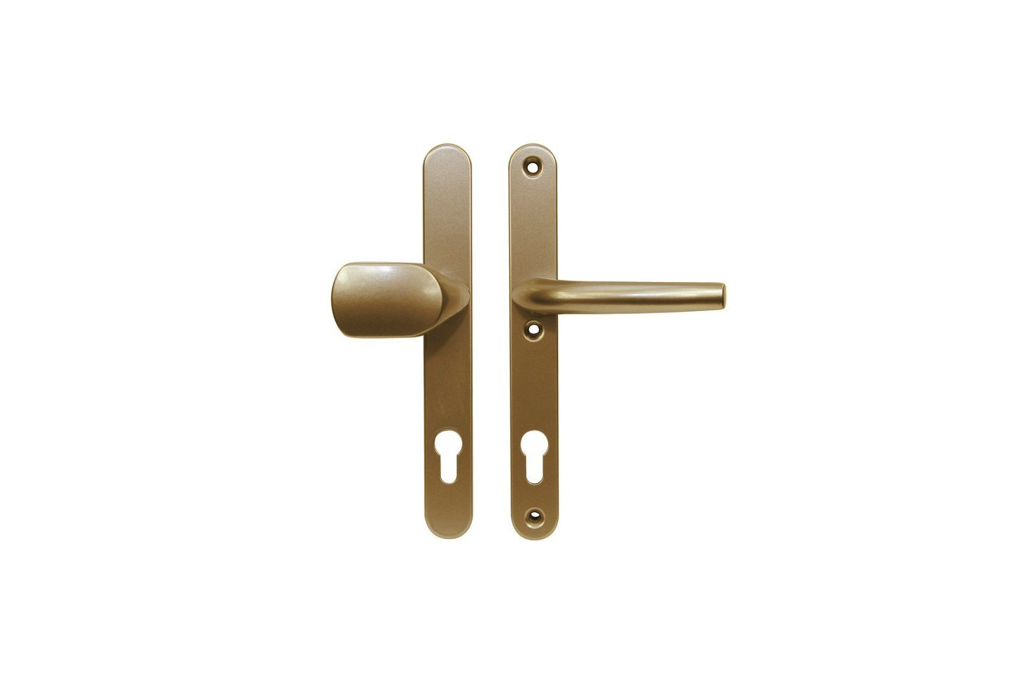 • Štítové kování z hliníku s pevně uloženou klikou vhodné pro vstupní plastové dveře.