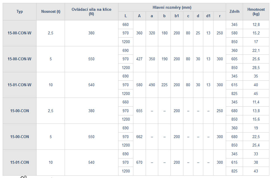 Při tahovém zatížení však bude zdvih hřebenového zvedáku menší než je uveden v tabulce. U nosnosti 2,5 t o 230 mm, u nosnosti 5 t o 250 mm a u nosnosti 10 t o 360 mm.