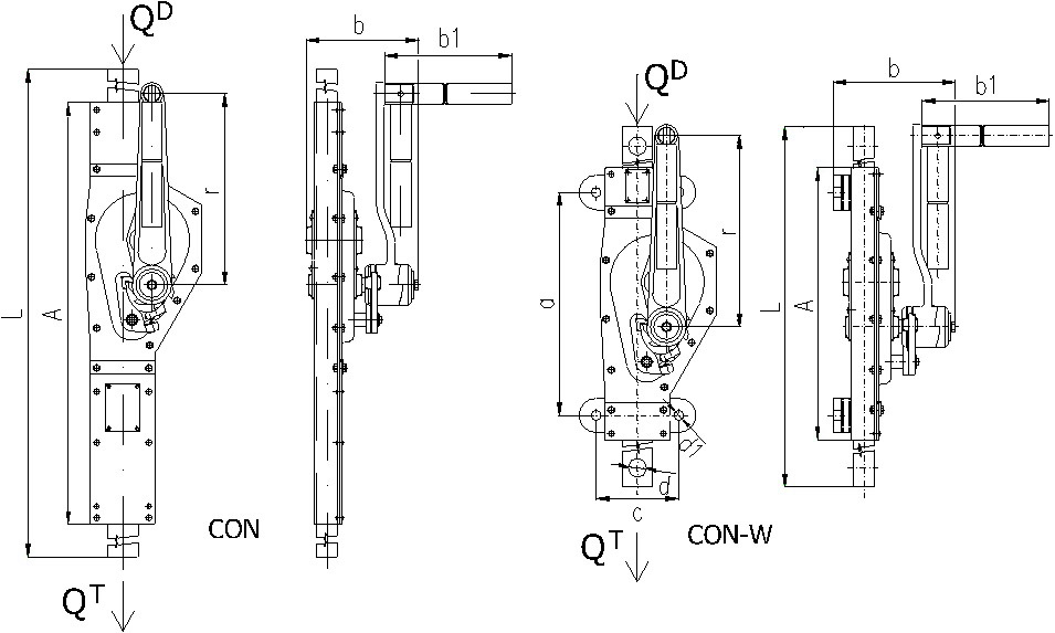 Při montáži hřebenového zvedáku v provedení CON a CON-W je nutno dbát na správnou orientaci zvedáku vůči jeho zatížení. Tlakové (tahové) zatížení hřebenové tyče musí působit vždy ve směru od náboje kliky k západkám (schéma – viz níže) nikdy ne naopak.