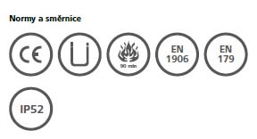 Normy a směrnice - kontrola podle směrnic CE | Certifikát Ü protipožární ochrany | EN 1634: 90 minut | ÖNORM 3859: 90 minut | EN 1906 | EN 179 | stupeň krytí IP52 | DIN 18257: ES0 (se stabilizační