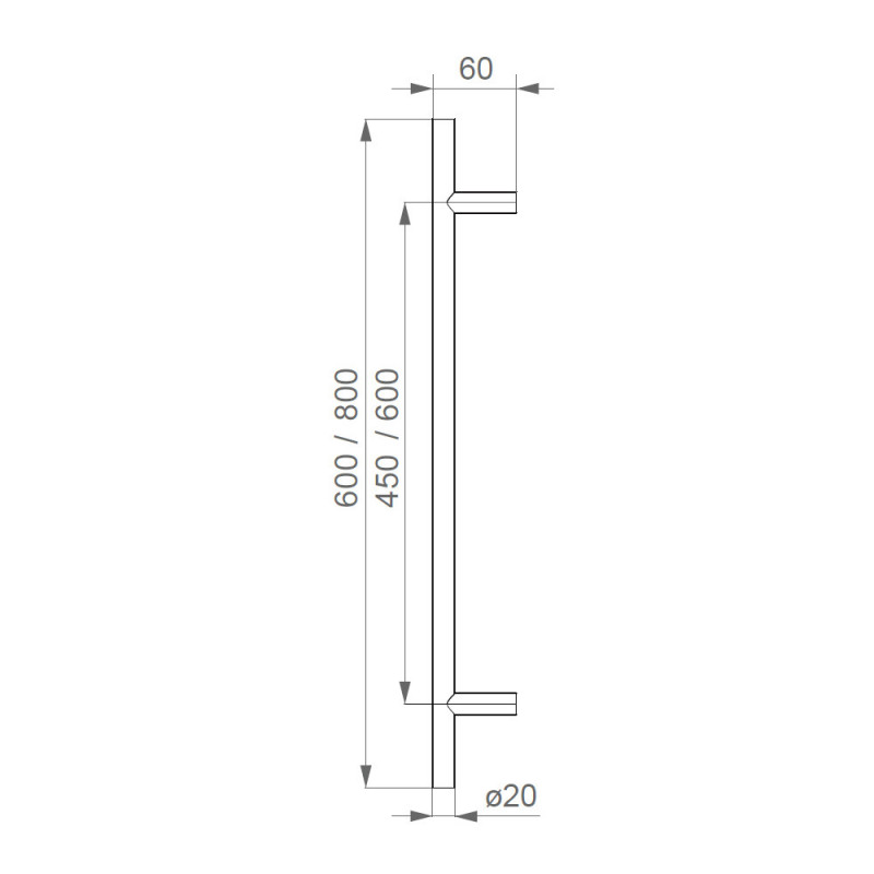 Toto dveřní madlo je dostupné v délce 600 (rozteč 450) nebo 800 (rozteč 600) mm, v páru pro oboustranné použití, nebo jako kus pro jednostranné použití. Pár není možné použít jako dvě jednostranná madla. Instalace svisle nebo vodorovně.