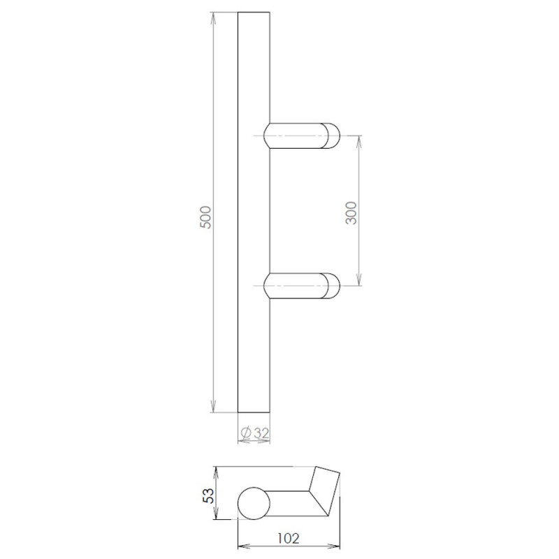 Toto dveřní madlo je dostupné v páru pro oboustranné použití, nebo jako kus pro jednostranné použití. Celková délka 500 mm, rozteč 300 mm. Pár není možné použít jako dvě jednostranná madla.