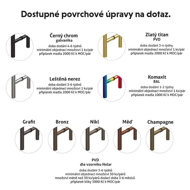 Toto dveřní madlo je dostupné v celkové délce 382 (rozteč 350), 532 (rozteč 500), 632 (rozteč 600), 732 (rozteč 700), 832 (rozteč 800) nebo 1032 (rozteč 1000) mm v páru pro oboustranné použití, nebo jako kus pro jednostranné použití. Pár není možné použít jako dvě jednostranná madla.
