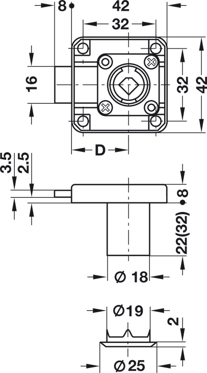 se závorou k přišroubování, backset 25 mm. Jde o standardní profil pro sériovou výrobu nábytku, délka válce 22 mm, montáž pravá. Tělo zámku: zinková slitina