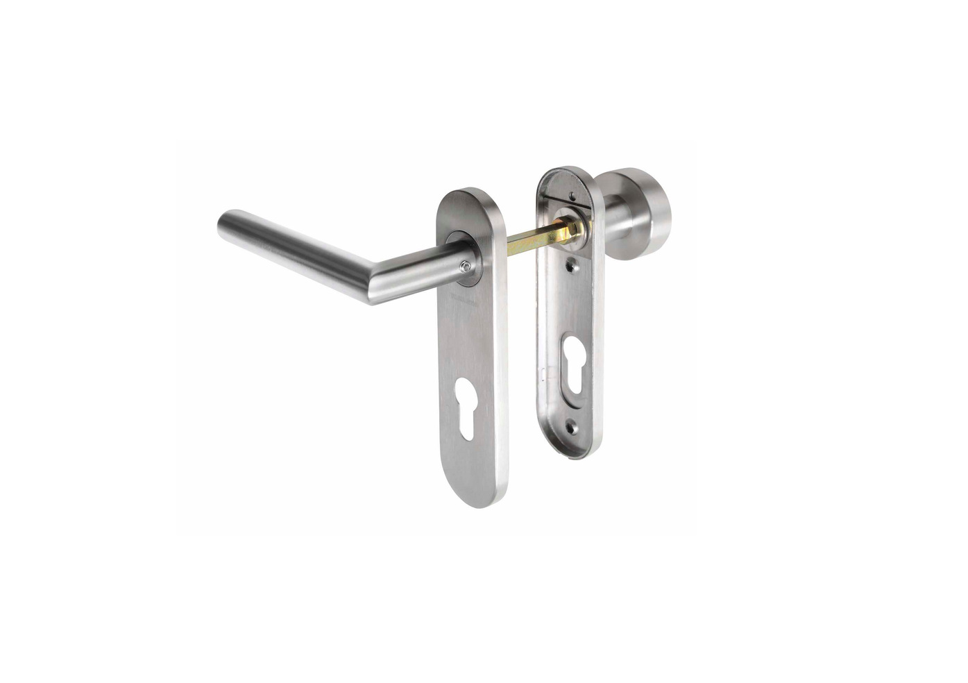 • Krátké oválné štítové kování z nerezového materiálu s pevnou vyosenou koulí a klikou do L s vratnou pružinou.