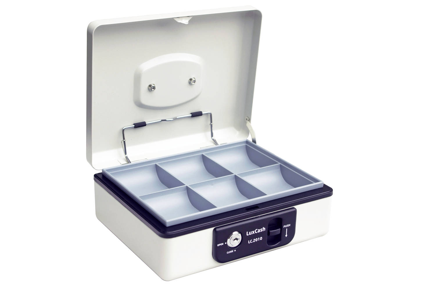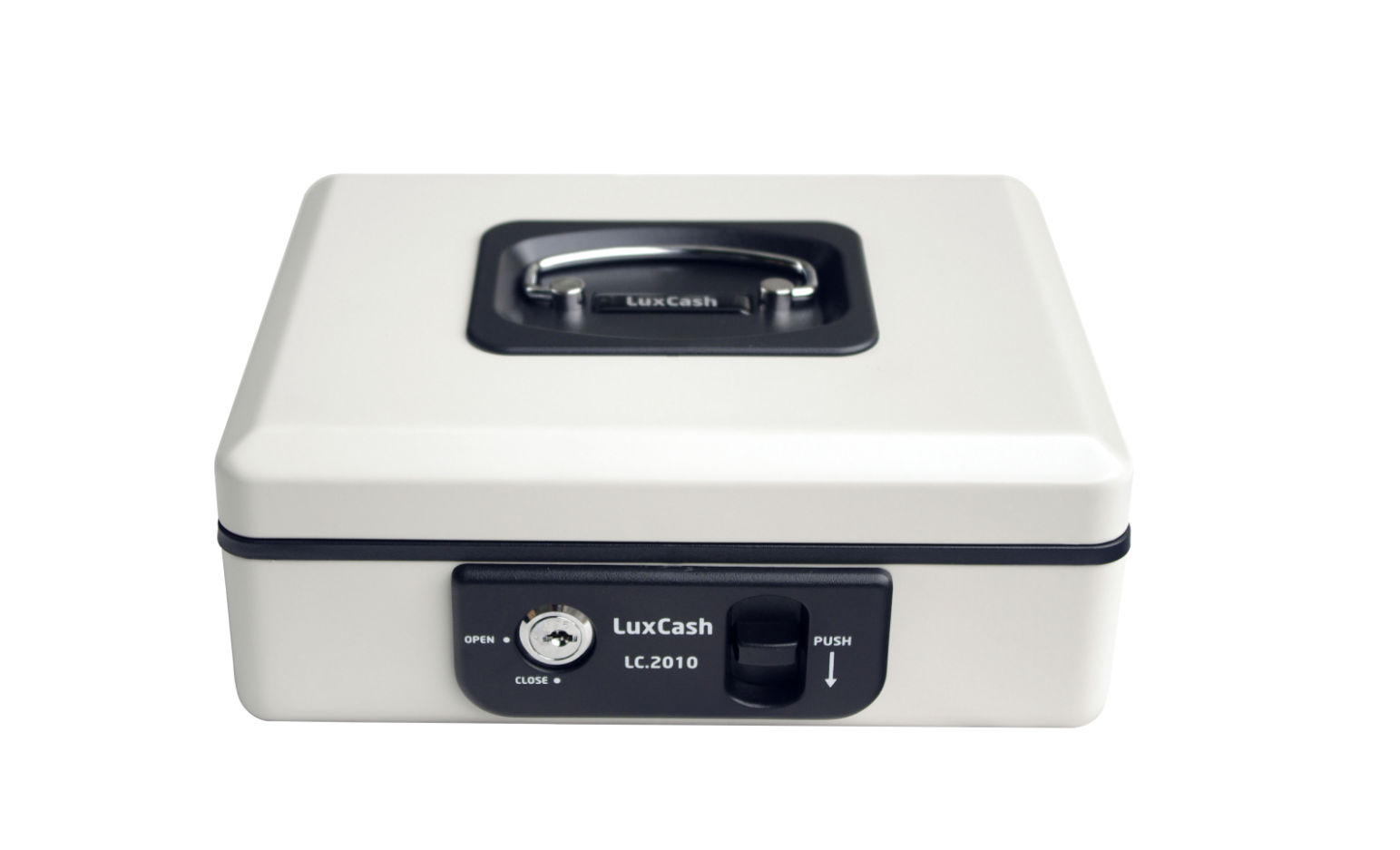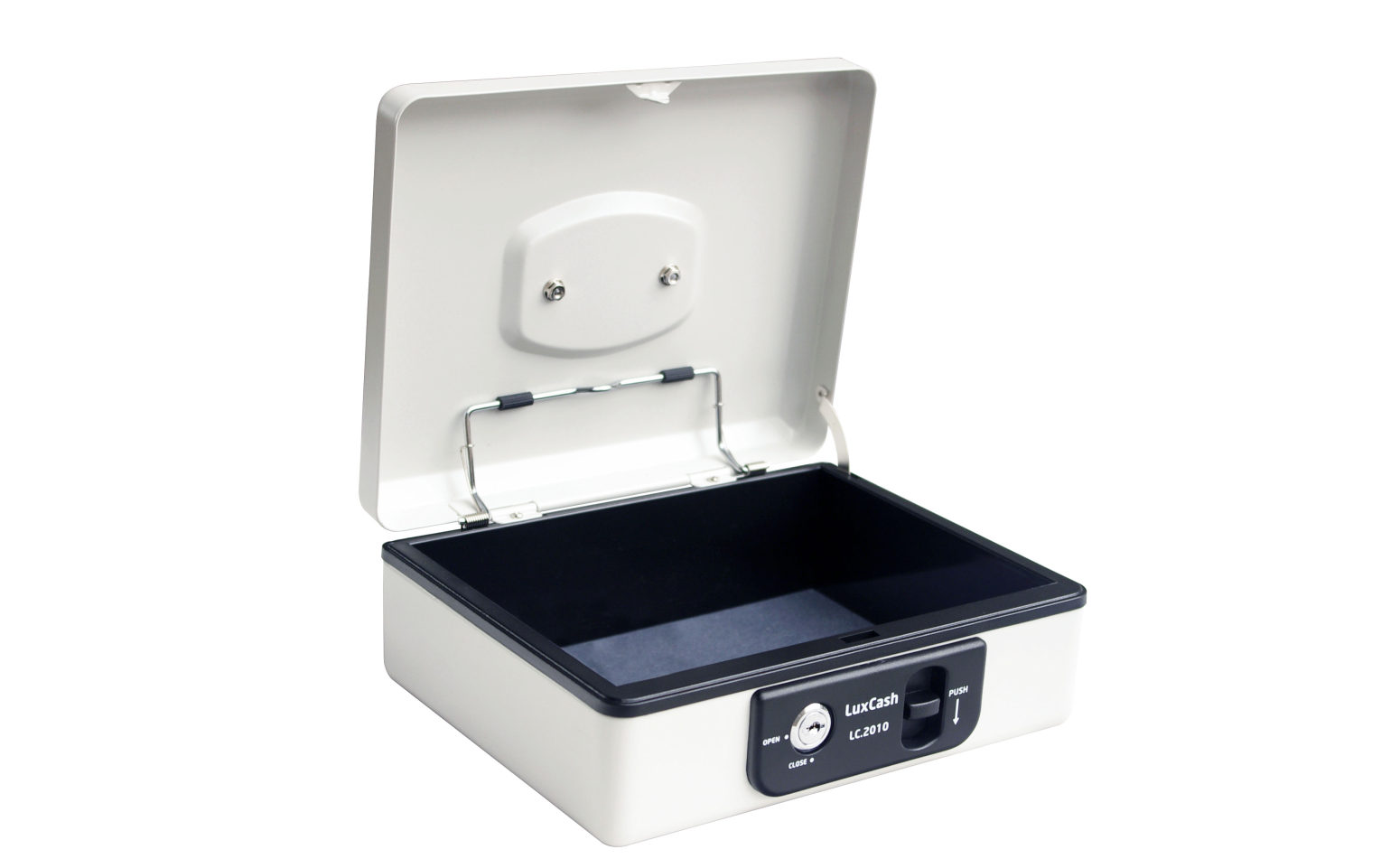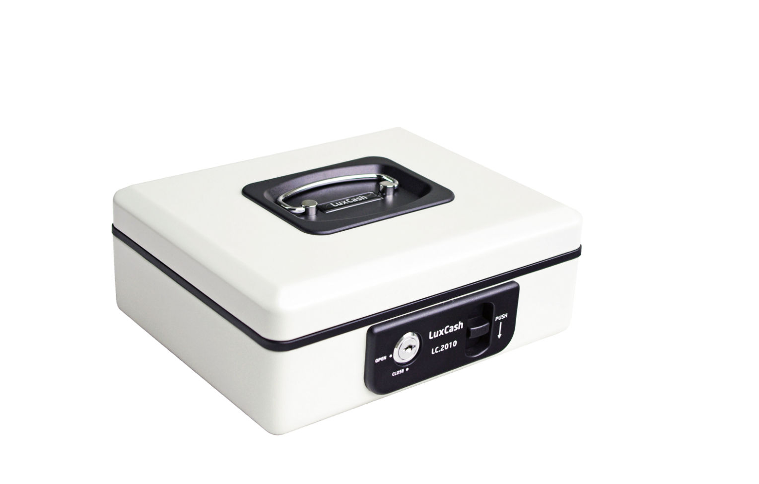 • Uzamykatelná pokladnička z ocelového plechu s blokací proti samovolnému zavření.