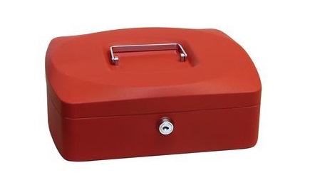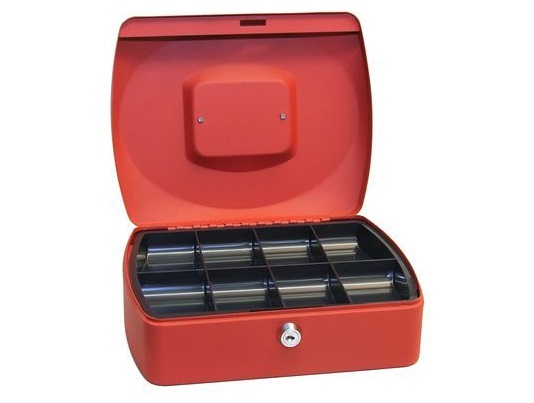 Uzamykatelná pokladnička z ocelového plechu k bezpečné úschově mincí a bankovek.