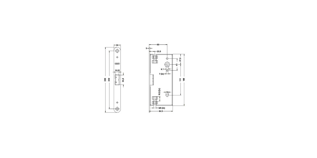 • rozteč 72 mm, backset 65 mm, hloubka zádlabu 84,5 mm, šířka čela 24 mm, výška čela 235 mm, tloušťka čela 3 mm, horní ořech dělený 9 mm