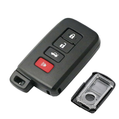 Náhradní pouzdro pro dálkový ovladač Toyota typu TOY40 s celkem čtyřmi tlačítky: zamykání, odemykání, otevírání kufru a červené tlačítko PANIC pro nouzové situace. Transparentní kryt chrání elektroniku před poškozením, opotřebením a vlhkostí, zatímco přesné výřezy zajišťují plnou funkčnost všech tlačítek.