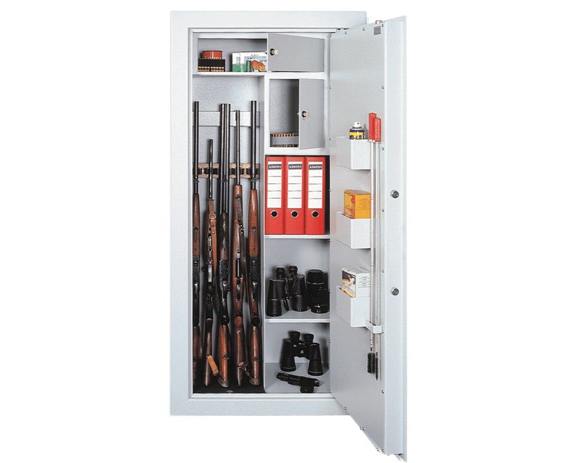 • Jedna polovina trezoru určená k úschově loveckých, sportovních a starožitných zbraní (max. 5 zbraní) včetně optických zaměřovačů.