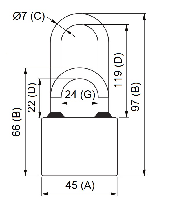 • Litinový visací zámek s gumovými kroužky chránící tělo proti průniku vody.