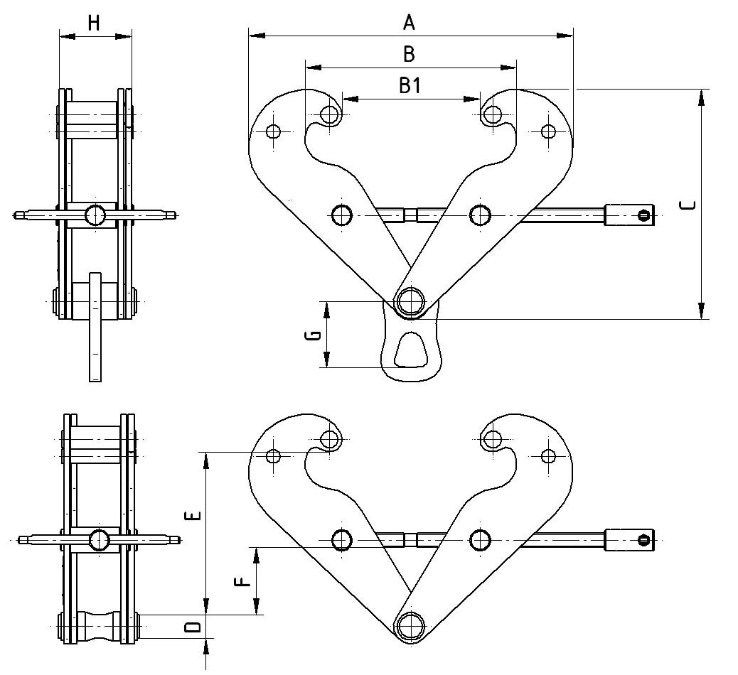 • slouží pro snadné a rychlé zavěšení ručních zdvihadel na nosníky nebo sloupy profilu tvaru I (I, IPE, HEB, HEA) nebo T.